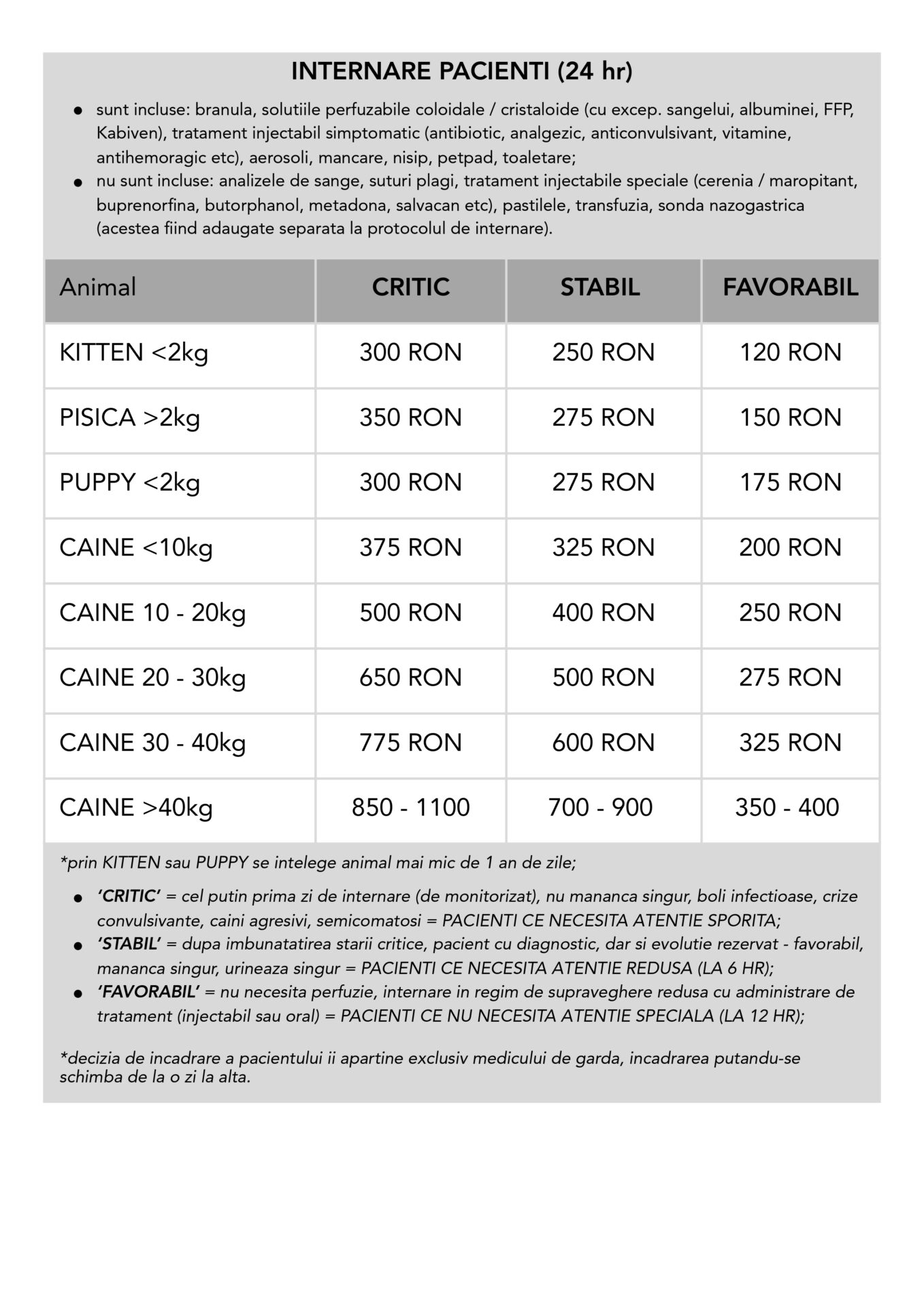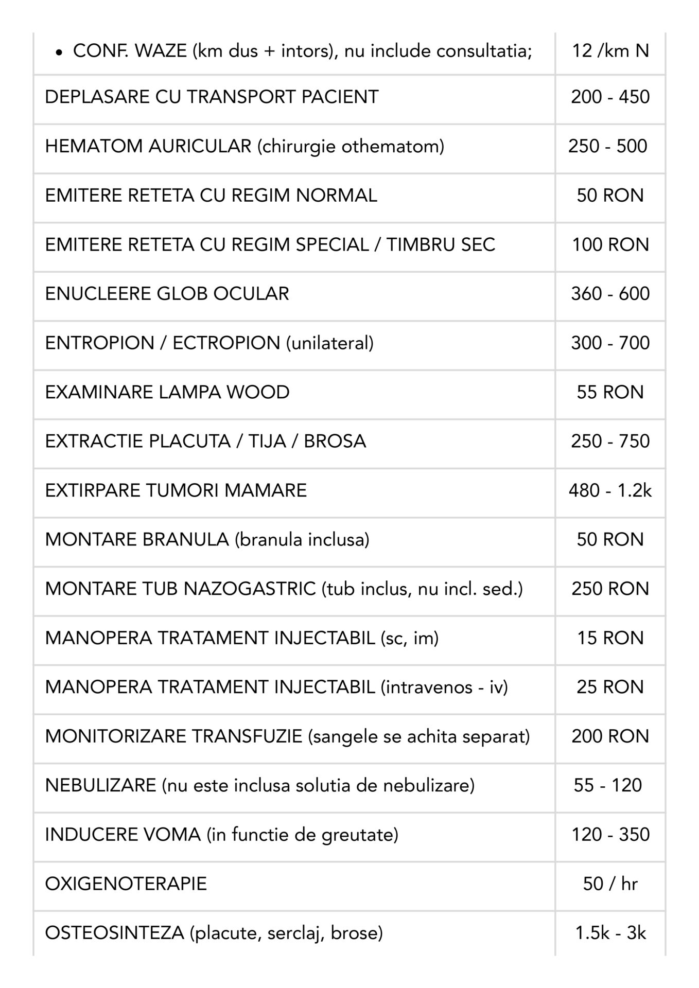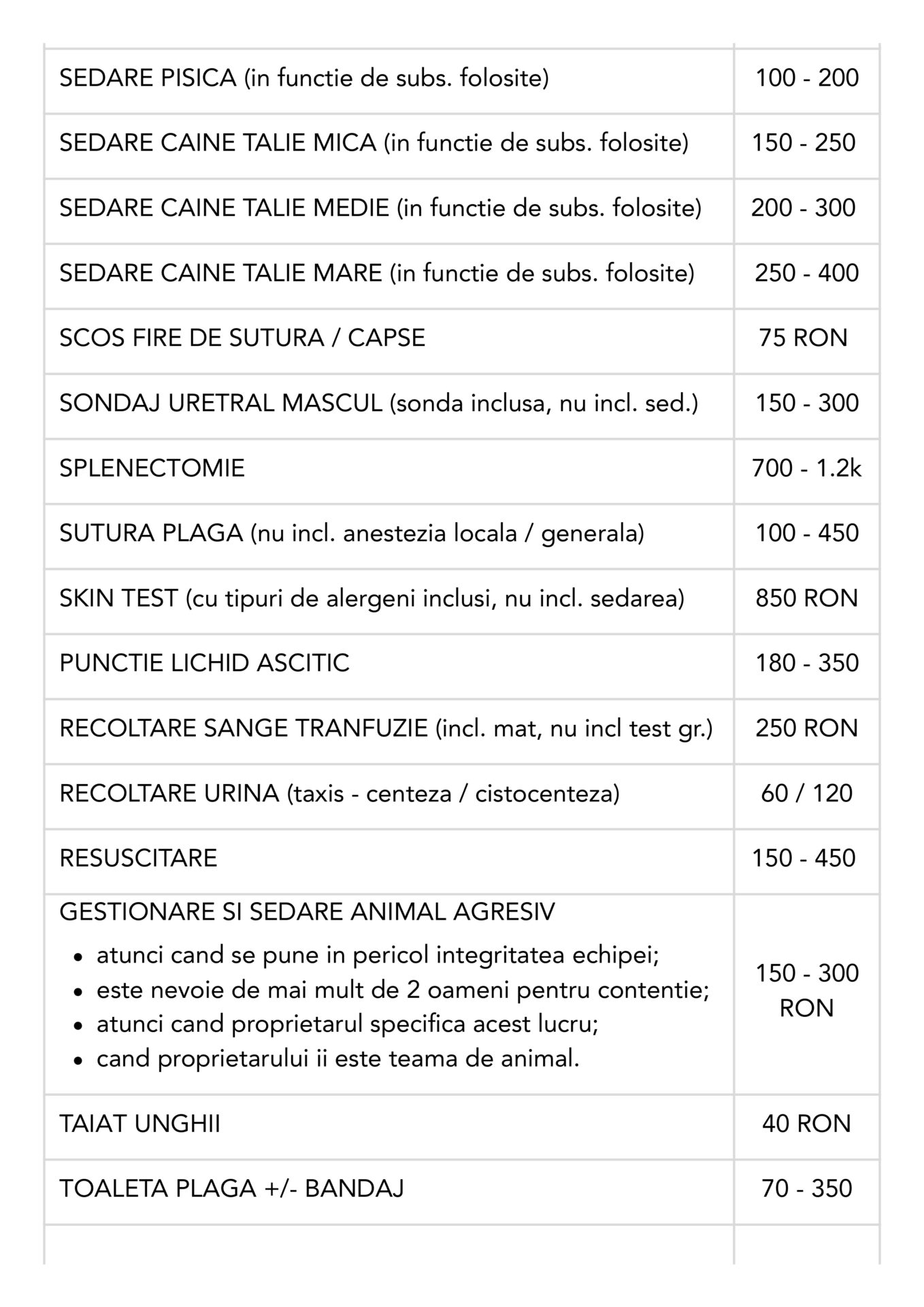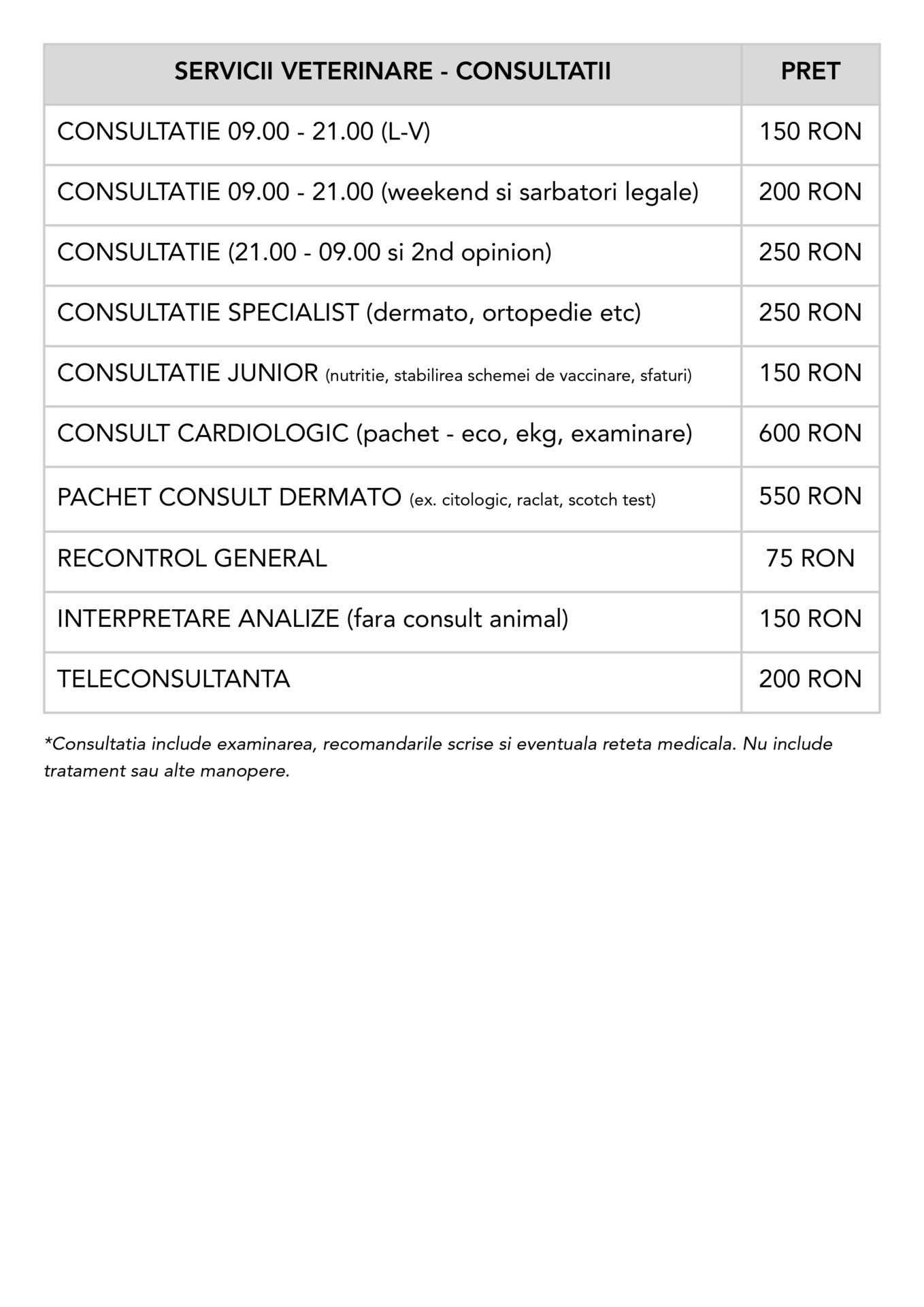 Pentru consultatii la domiciliu in Bucuresti pretul deplasarii este de 200 ron (09.00 – 21.00), respectiv 300 ron (21.00 – 09.00) , la care se adauga pretul consultului de 100 ron (zi), respectiv 200 ron (noapte) sau 150 ron (weekend si sarbatori legale). Pentru alt tip de deplasari, pretul pentru ambulanta veterinara porneste de la 100 ron si va fi stabilit telefonic si depinde de tipul de deplasare: daca este urgenta, daca necesita transportul animalului la clinica veterinara, depinde de intervalul orar, sarbatori legale etc.