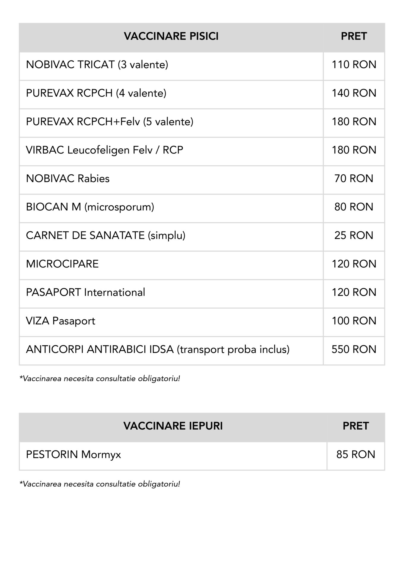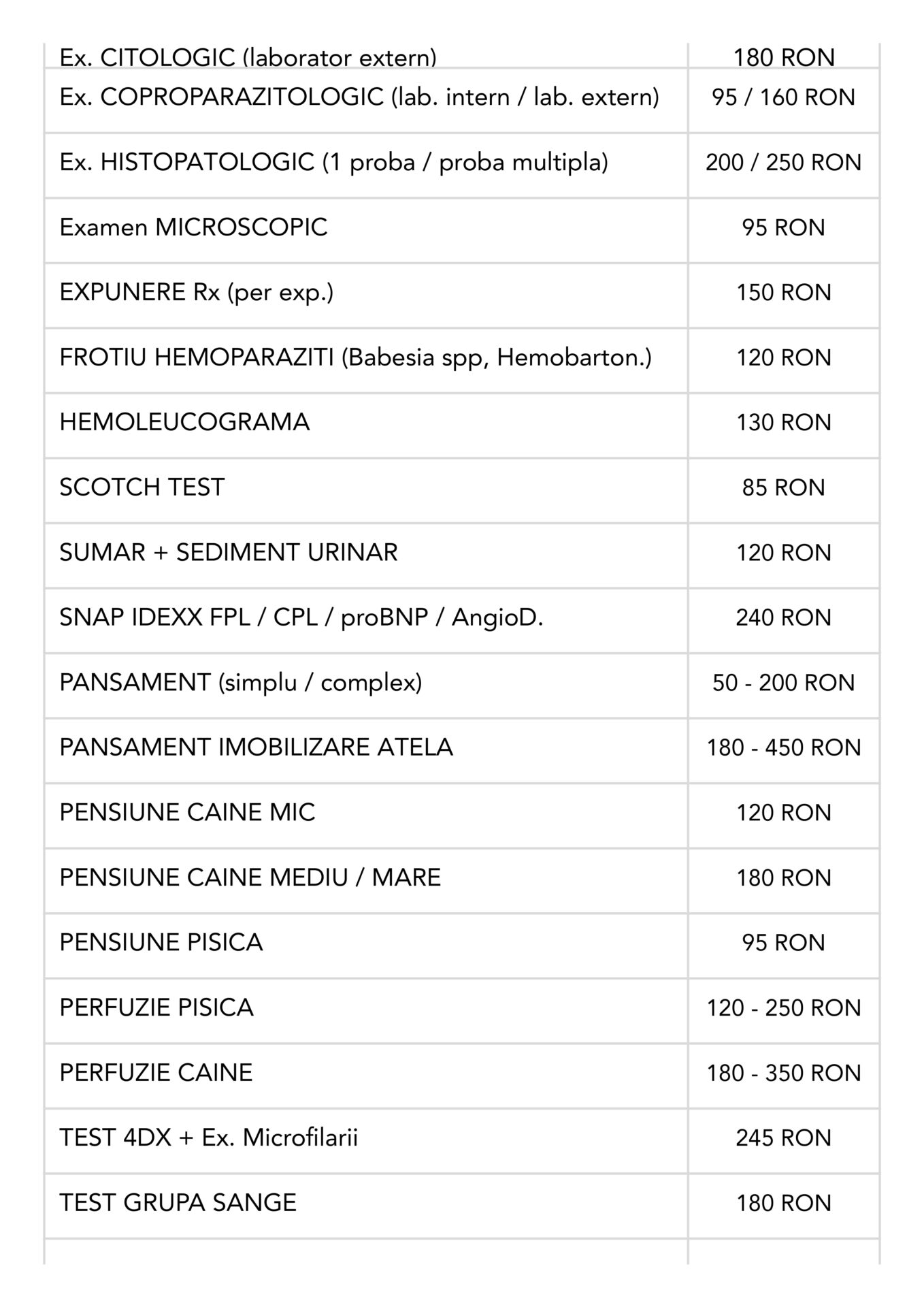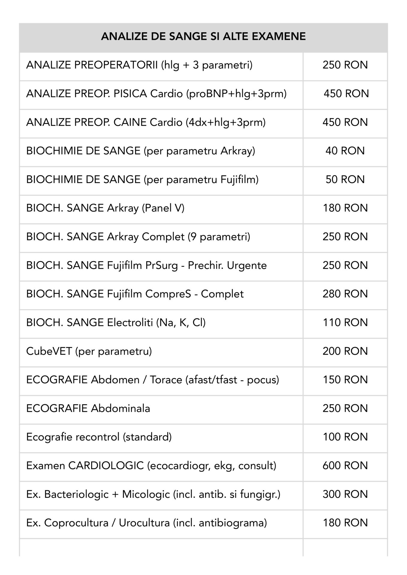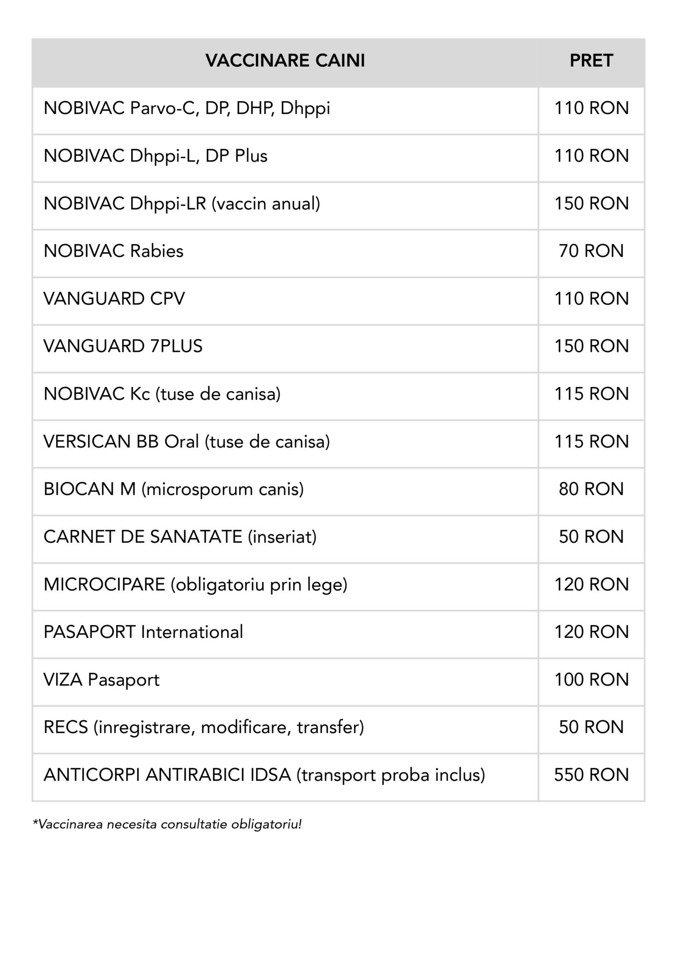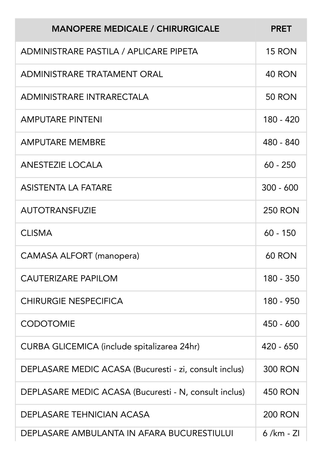 Pentru consultatii la domiciliu in Bucuresti pretul deplasarii este de 200 ron (09.00 – 21.00), respectiv 300 ron (21.00 – 09.00) , la care se adauga pretul consultului de 100 ron (zi), respectiv 200 ron (noapte) sau 150 ron (weekend si sarbatori legale). Pentru alt tip de deplasari, pretul pentru ambulanta veterinara porneste de la 100 ron si va fi stabilit telefonic si depinde de tipul de deplasare: daca este urgenta, daca necesita transportul animalului la clinica veterinara, depinde de intervalul orar, sarbatori legale etc.