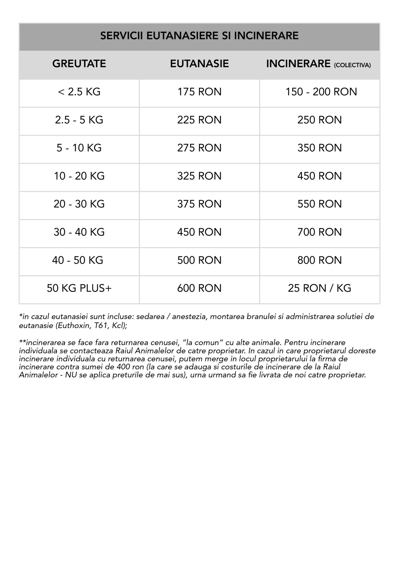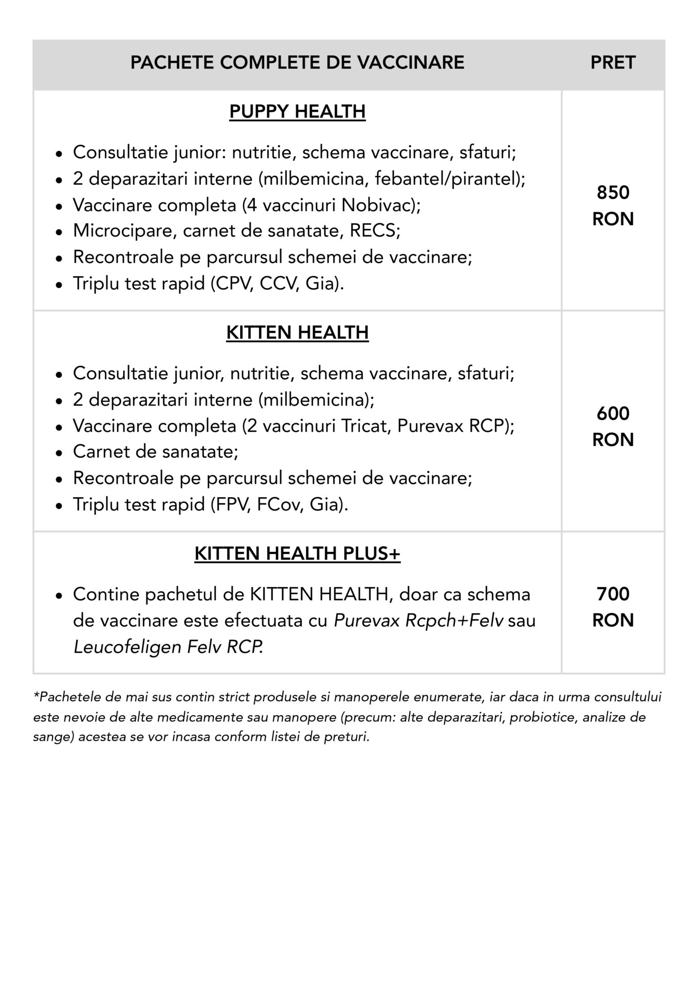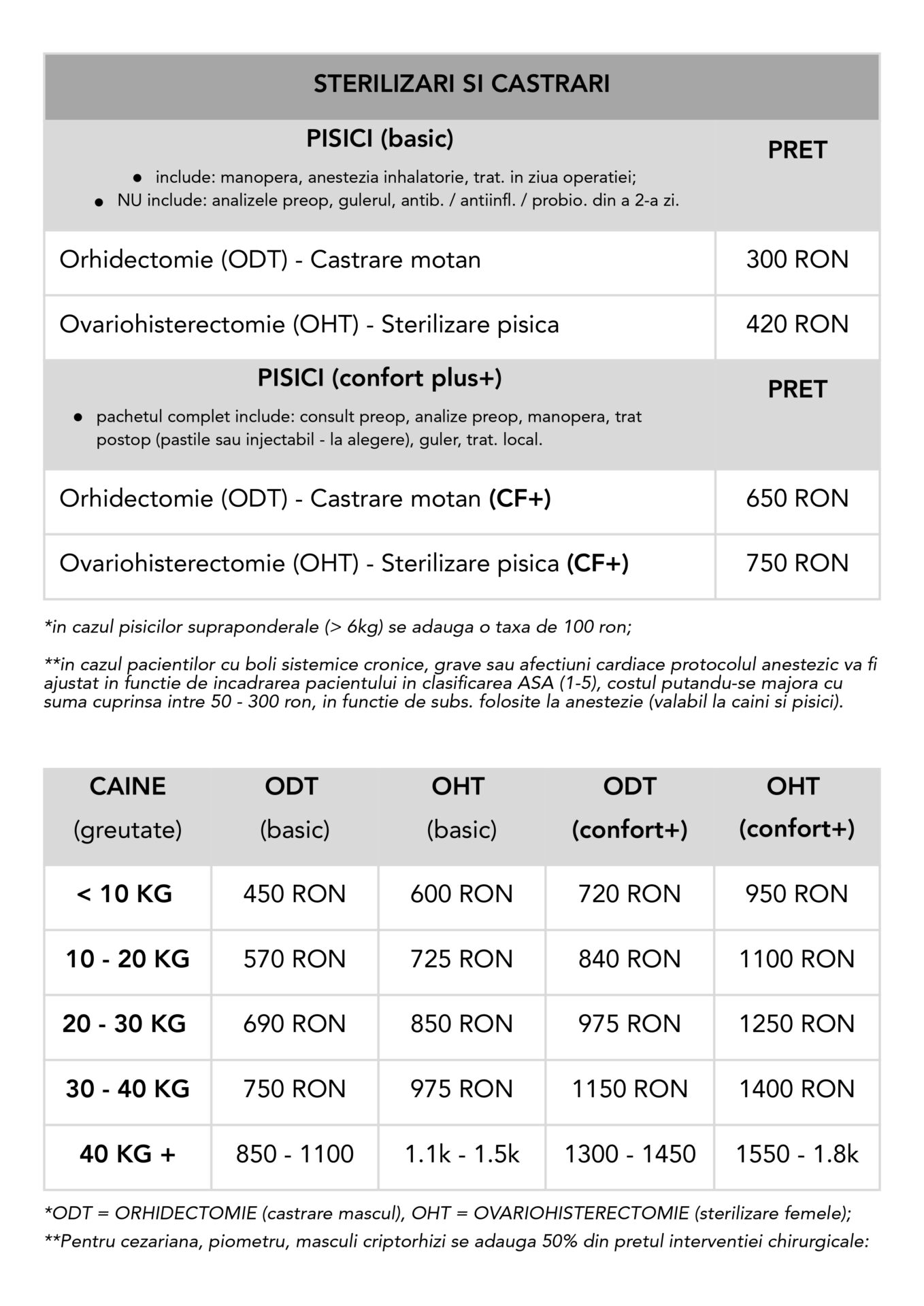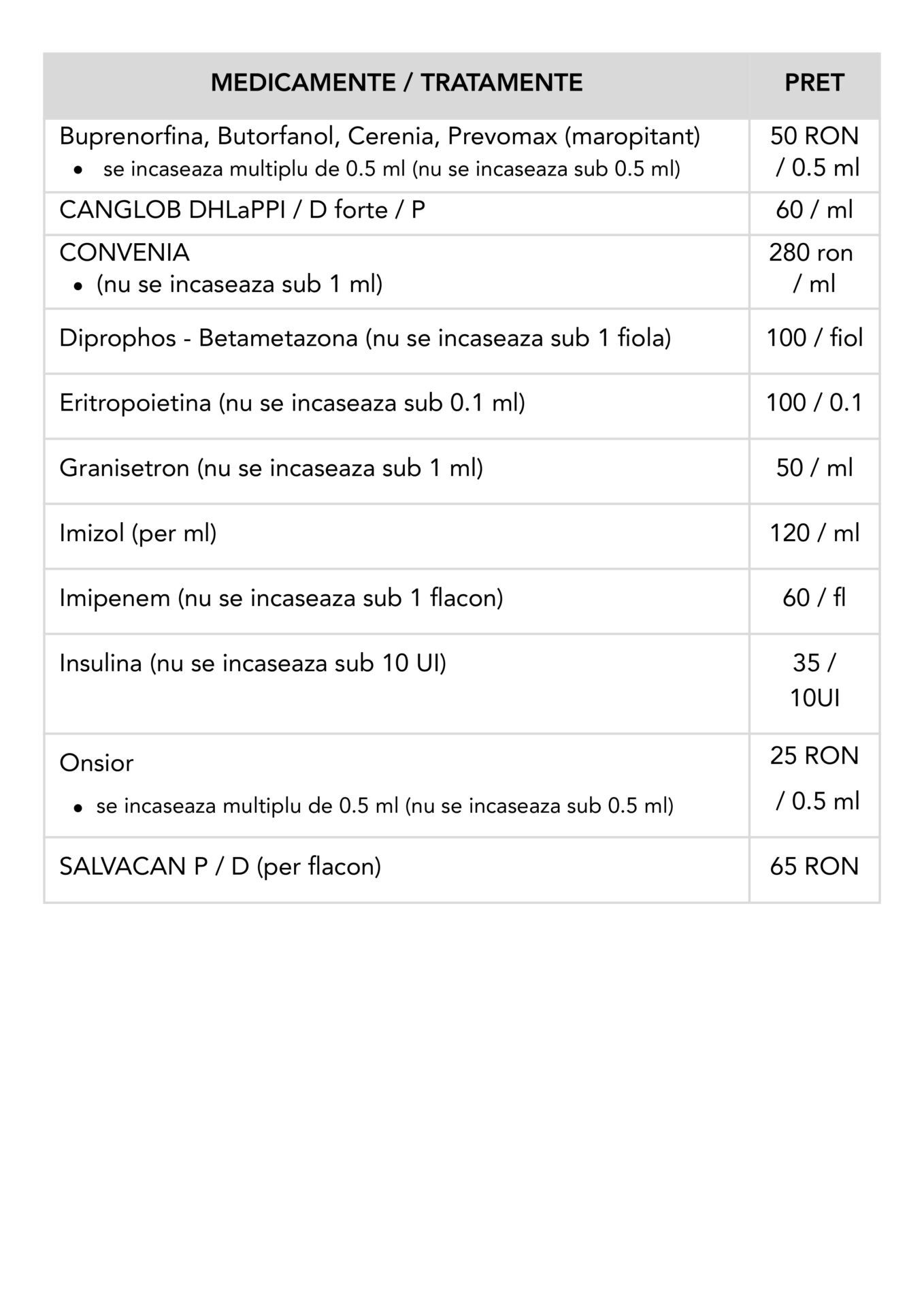 Pentru consultatii la domiciliu in Bucuresti pretul deplasarii este de 200 ron (09.00 – 21.00), respectiv 300 ron (21.00 – 09.00) , la care se adauga pretul consultului de 100 ron (zi), respectiv 200 ron (noapte) sau 150 ron (weekend si sarbatori legale). Pentru alt tip de deplasari, pretul pentru ambulanta veterinara porneste de la 100 ron si va fi stabilit telefonic si depinde de tipul de deplasare: daca este urgenta, daca necesita transportul animalului la clinica veterinara, depinde de intervalul orar, sarbatori legale etc.