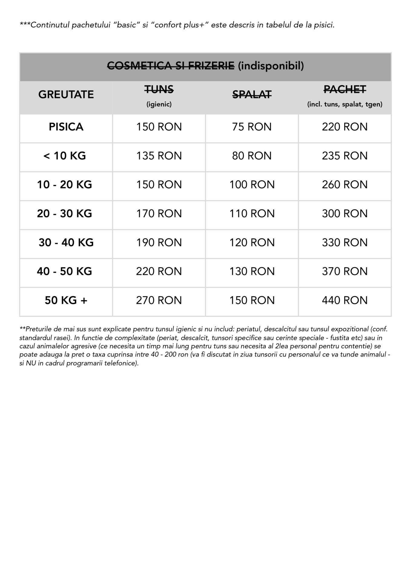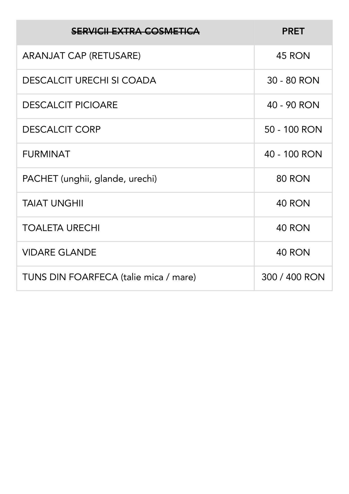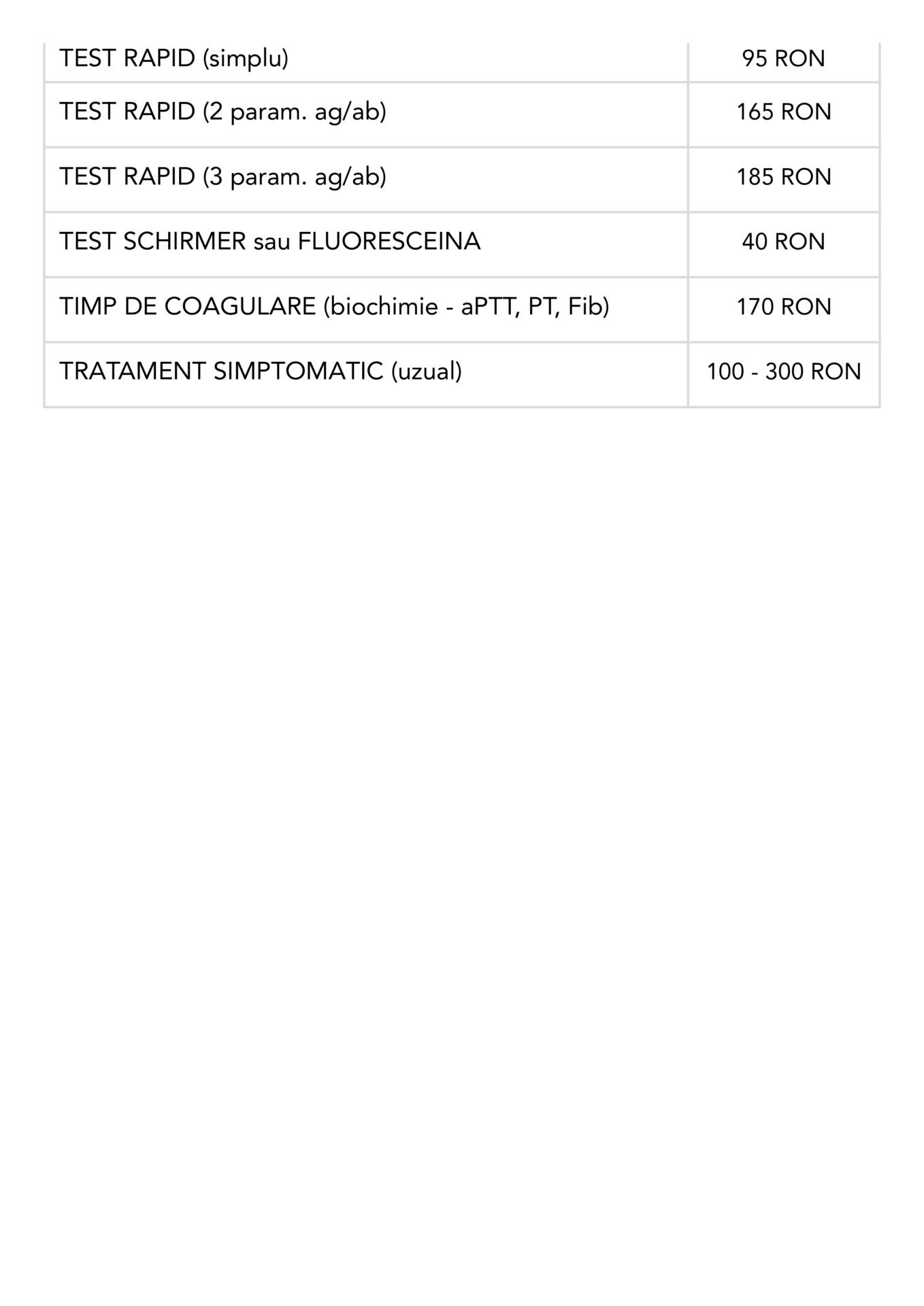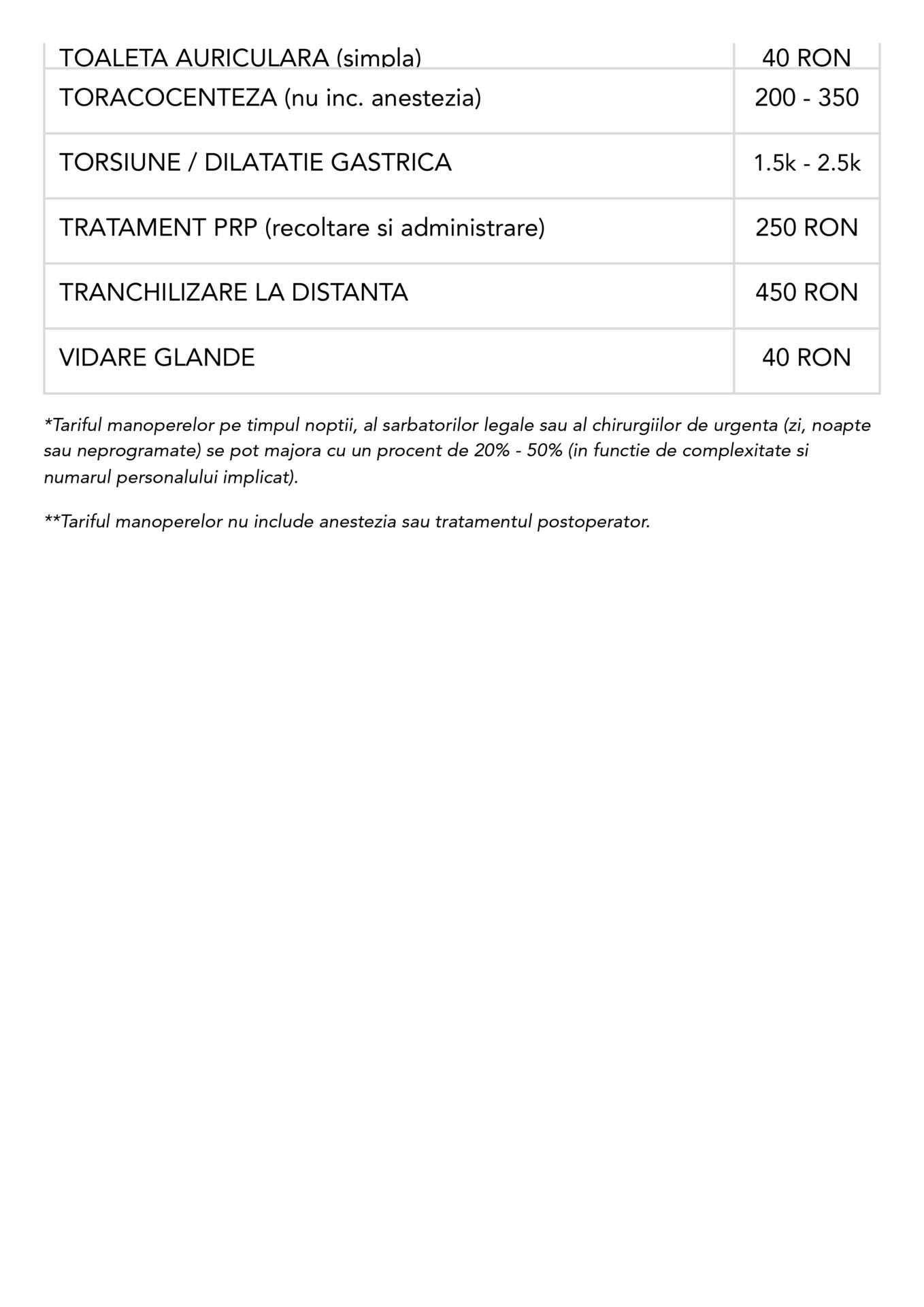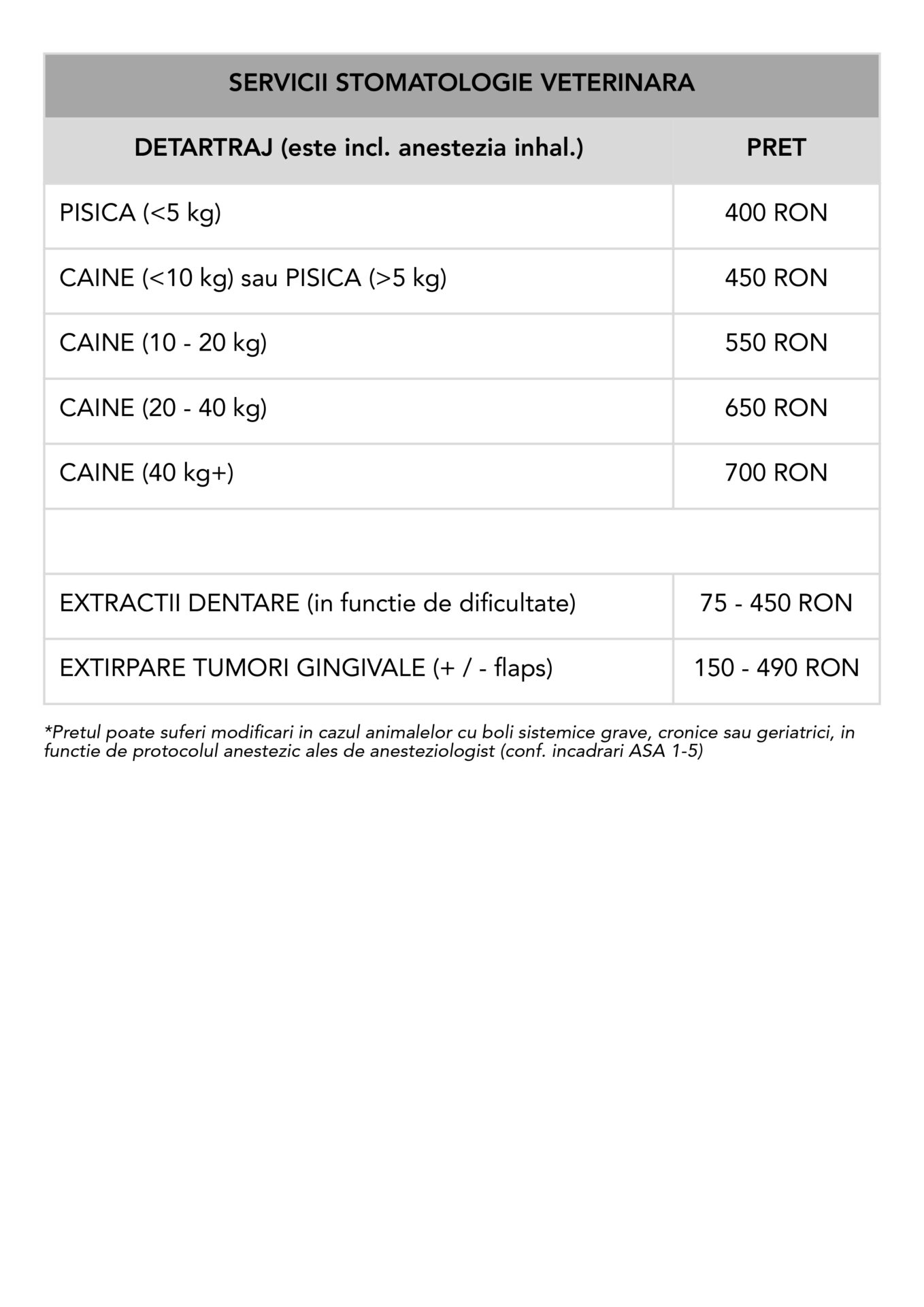 Pentru consultatii la domiciliu in Bucuresti pretul deplasarii este de 200 ron (09.00 – 21.00), respectiv 300 ron (21.00 – 09.00) , la care se adauga pretul consultului de 100 ron (zi), respectiv 200 ron (noapte) sau 150 ron (weekend si sarbatori legale). Pentru alt tip de deplasari, pretul pentru ambulanta veterinara porneste de la 100 ron si va fi stabilit telefonic si depinde de tipul de deplasare: daca este urgenta, daca necesita transportul animalului la clinica veterinara, depinde de intervalul orar, sarbatori legale etc.
